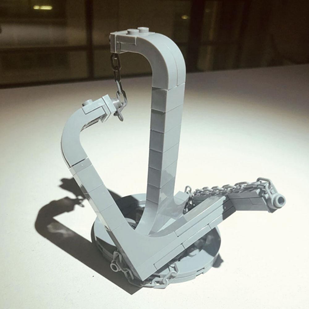 上側のブロックには重力がはたらきます。当然、重力は下向きの力なので、それをカバーするために上側ブロックのL字の先端を土台の先端を短いチェーンで繋いで支える必要があります。短いチェーンだけではバランスが悪く、上側のブロックは手前や後方に倒れてしまいますね。これをカバーするために、T字部分と土台を2本の長いチェーンで繋ぎます