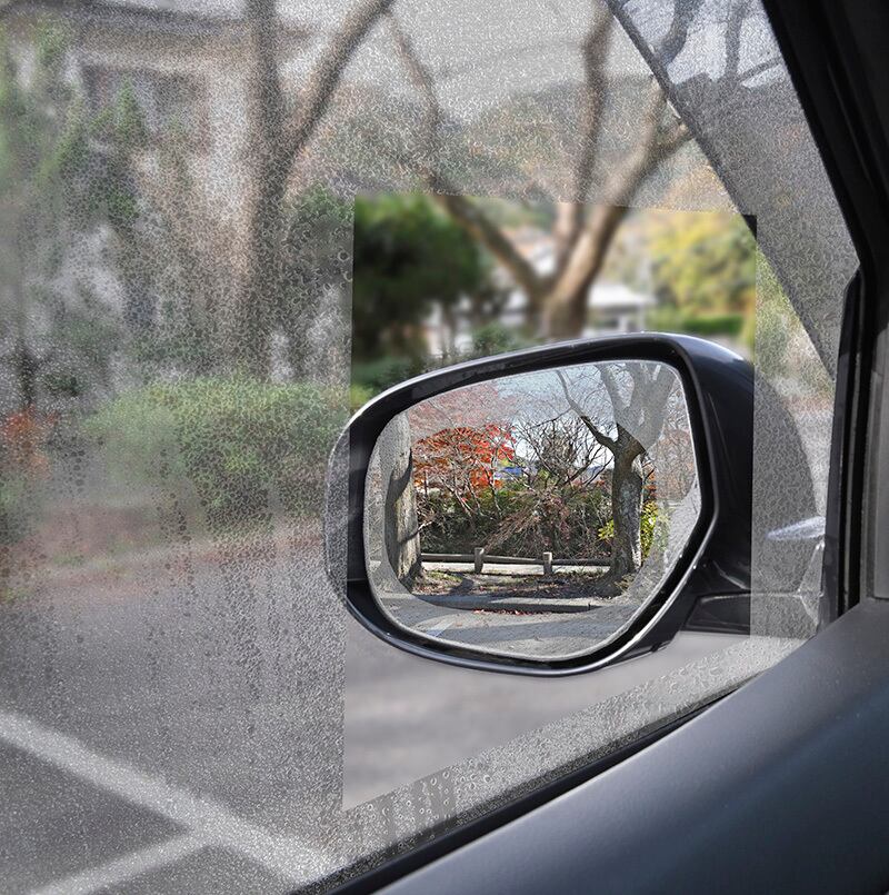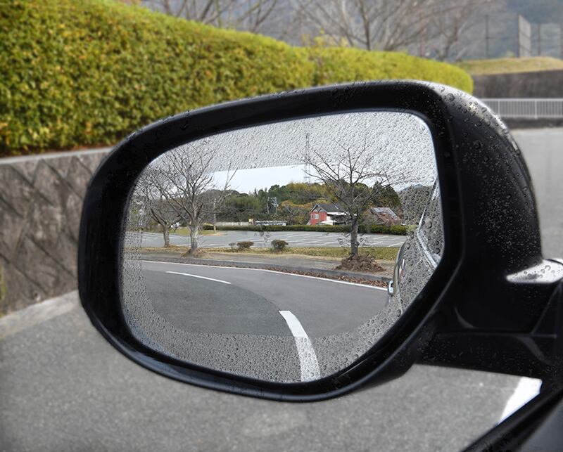 このフィルムを貼れば夜でも車庫入れの際にミラーが水滴を弾くのでしっかり見えます。