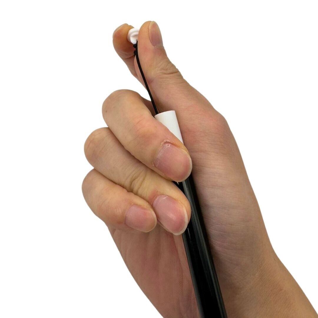 2)白い部品をストッパーにして手の甲側に隠すようにゴム紐を人差し指と中指で挟みます