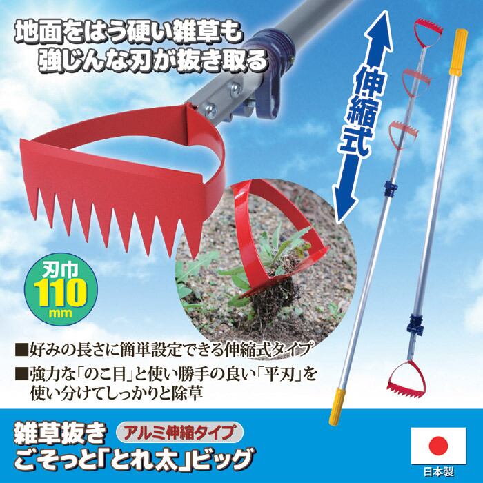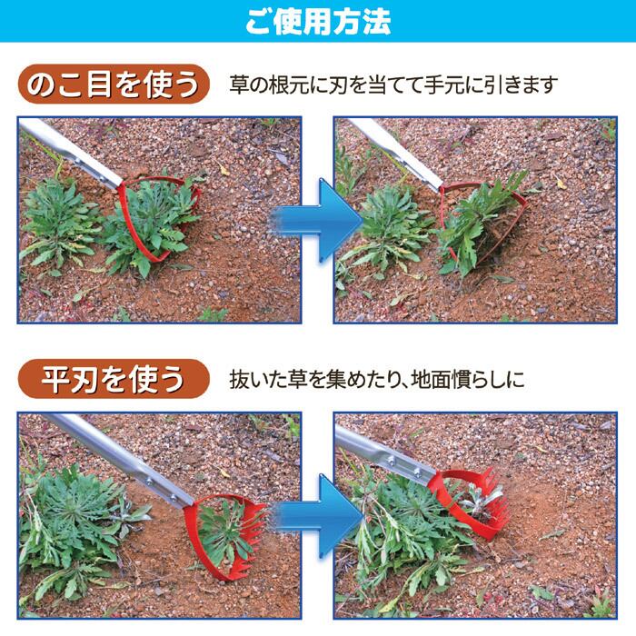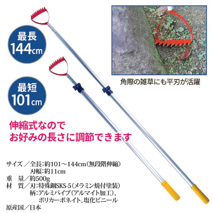 雑草除去作業は大変です。腰をかがめて、気の遠くなるような作業。本品はラクに、効率よく、気持ちよく作業ができるように、「立ったまま」作業ができる便利な道具です。しっかりと根付いた雑草も、鋭い「のこ目」を使えば、「ガツっと」取れます、まさに快感、反対側の「平刃」を使えば、取り辛い「キワ」の雑草抜きが簡単にでき、抜き終わった後の地ならしもキレイにできます。柄は伸縮式なのでコンパクトに収納できます。