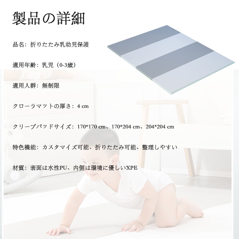 【幅広い用途】 軽量化設計で、持ち運びも大きな負担にはなりません。片づけも女性一人でも5秒以内に折りたためるので楽チン! プレイマットは一年中使用でき、幅広い用途があるので、赤ちゃんが成長してもずっと使えます。 例えば、リビングルームやベッドルームでくつろぐ時や、おうちヨガやエクササイズ、ピクニックやキャンプなどのレジャーでも、ピクニックマットとして使用することもできます。 幅広い用途があるので、誕生日や出産祝いとして家族や友だちへのプレゼントにも最適です。