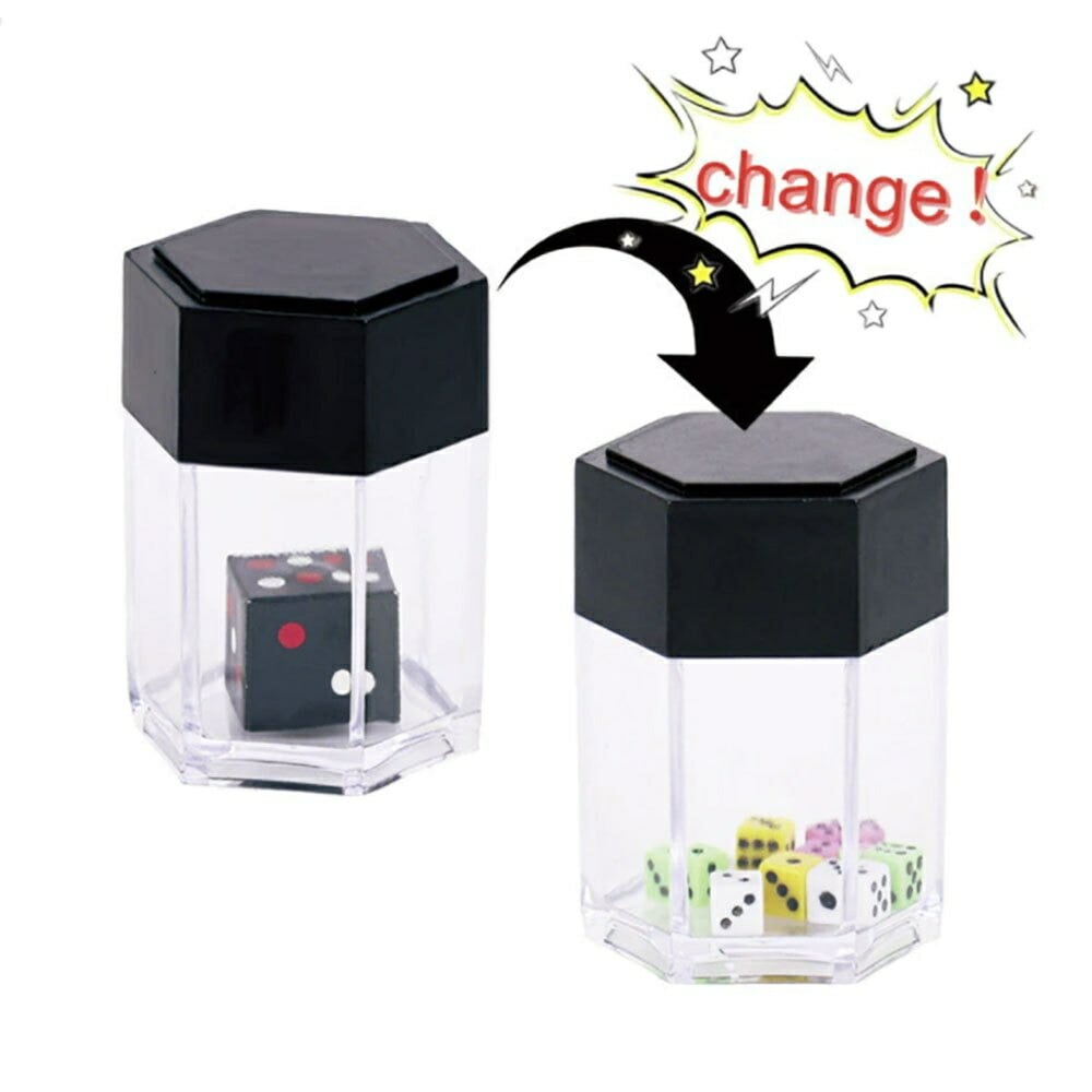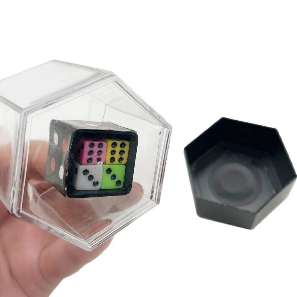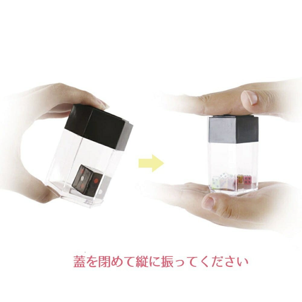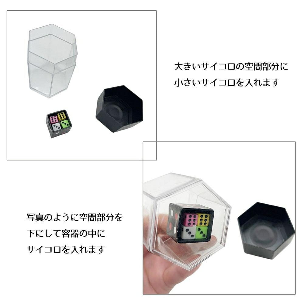 *説明書は付属しておりませんのでご了承ください。やり方についての詳しいご質問につきましてはお答えできかねます。インターネットにてクラッシュダイスとお調べいただきましたらすぐ出てきますのでそちらをご参照ください8コの小ダイスを大ダイスの中に入れます。ケースに入れフタをしめて一振りすると、なんと大ダイスが8個になります!大ダイスは蓋部分に磁石が付いており、そこに引っ付いて大ダイスの中の小ダイスだけが落ちるという仕組みです。粋な演出を組み込むとなかなかにプロっぽい演技もできてしまいます