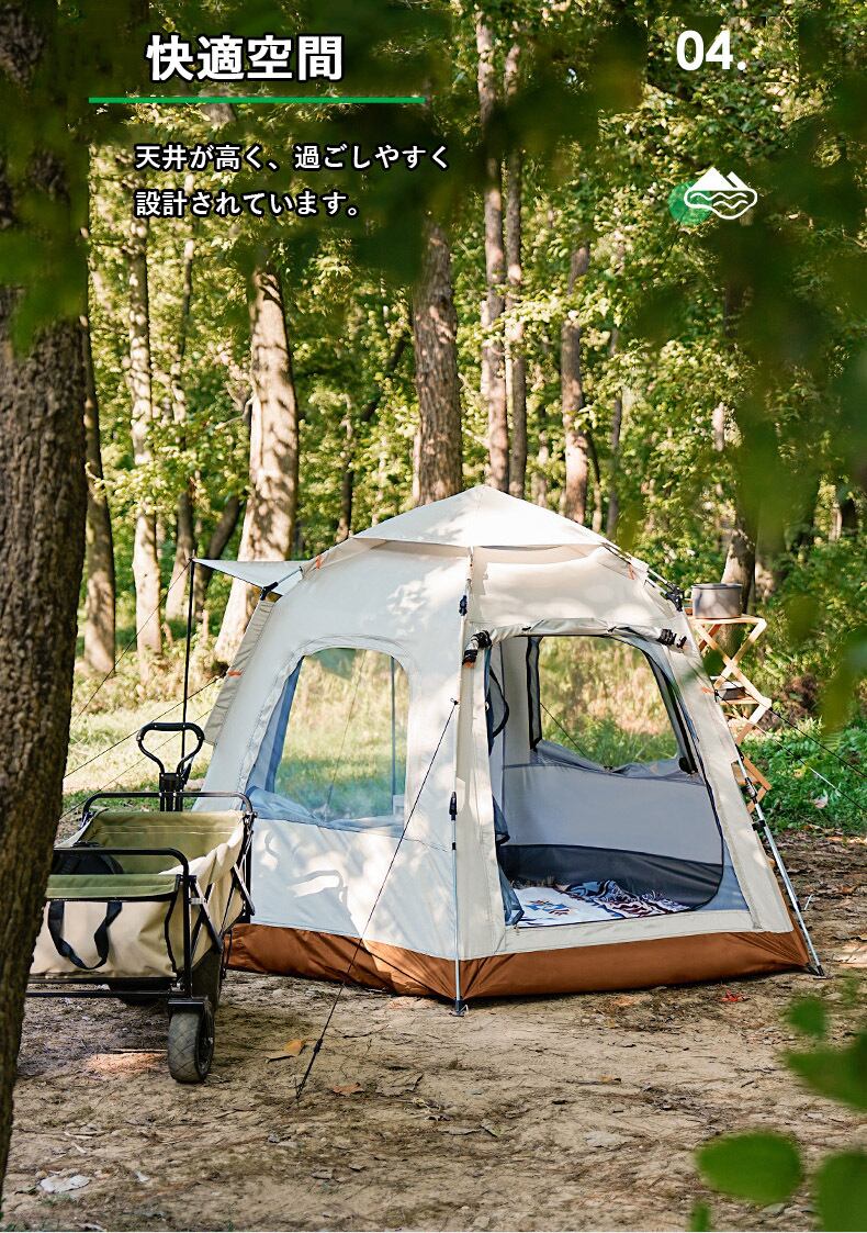 ワンタッチテント 4人6人用 キャンプ 簡単設営 uvカット2重層 大型 アウトドア 6角形 クイック 撥水加工 3〜4人用 ベージュ