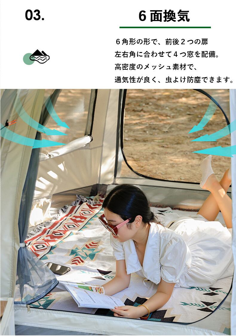 ・6角形の形で、前後2つの扉と左右角に合わせて4つの窓を配備。、高密度のメッシュ素材で。通気性が良く、虫よけ防塵できます。